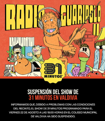 Suspensión del show de 31 Minutos en Valdivia Informamos a ustedes que, debido a problemas con las condiciones del recinto, el show de “31 Minutos” programado para el Leer más →